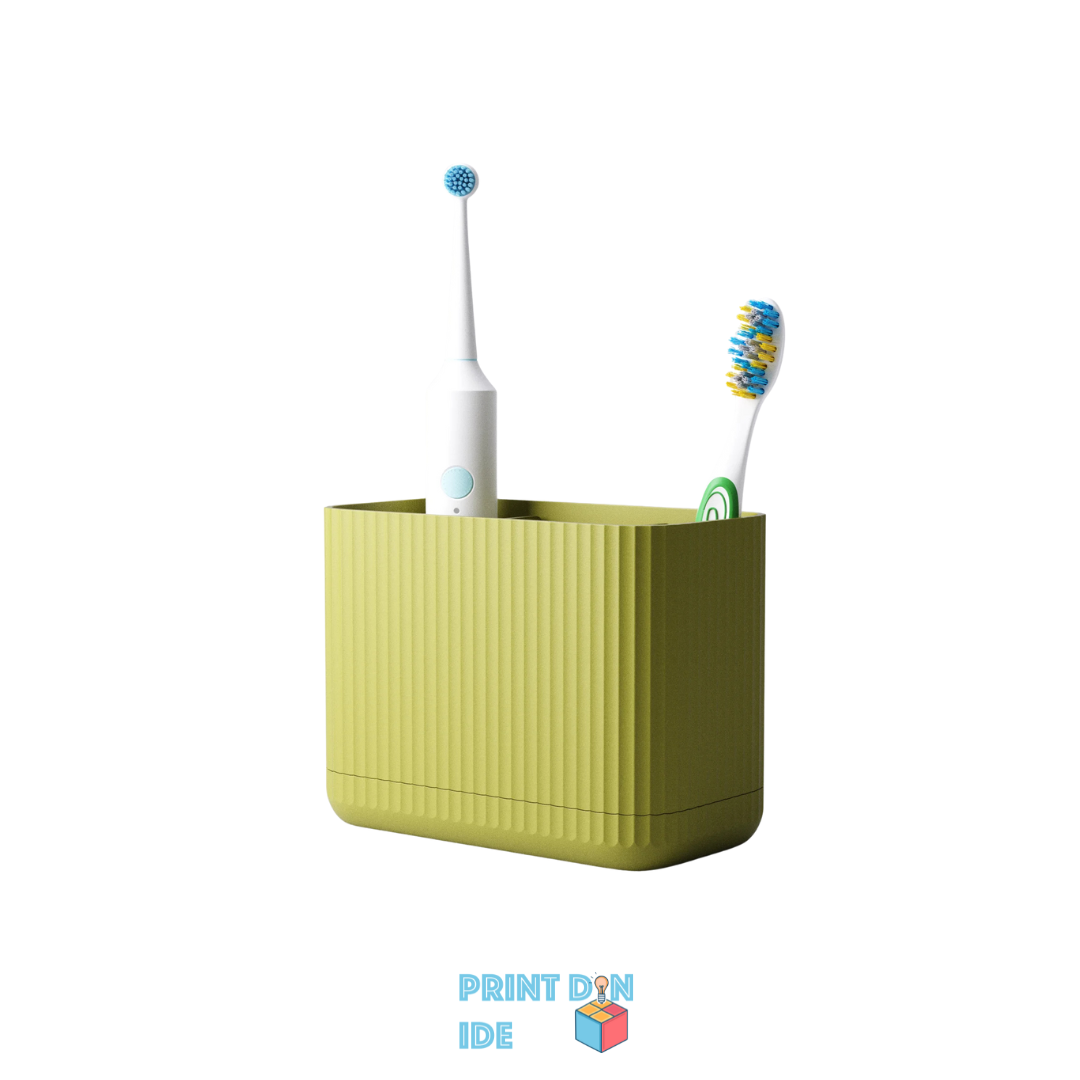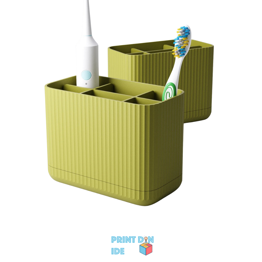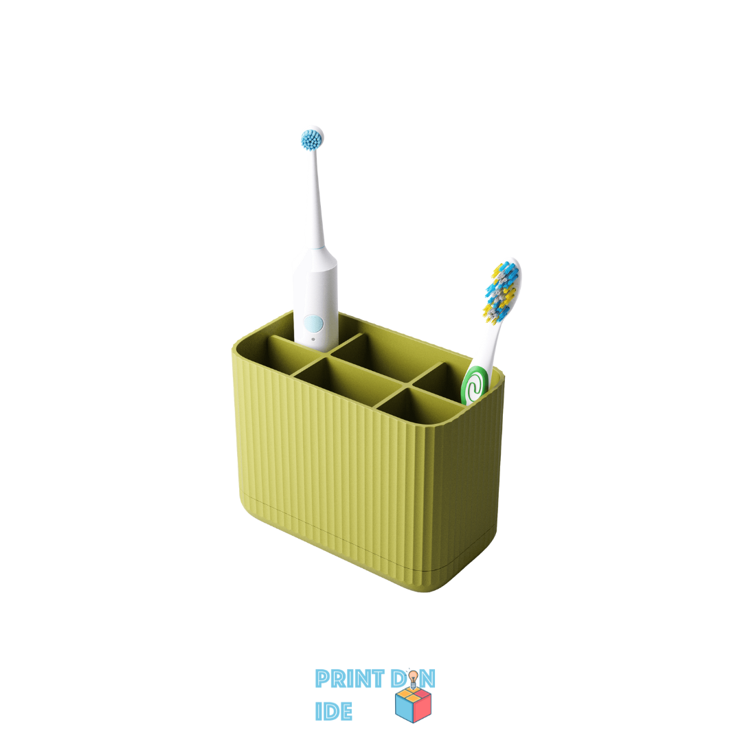 Sig farvel til rod og våde overflader – denne 3D-printede tandbørsteholder er skabt til både funktion og æstetik. Designet består af en todelt konstruktion: en hovedbeholder med syv separate rum og en drypbakke i bunden, der forhindrer overskydende vand i at samle sig direkte på bordet.